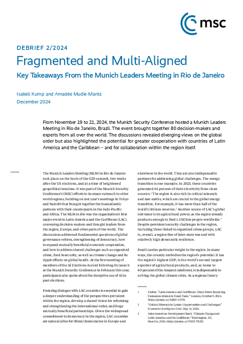 Isabell Kump and Amadée Mudie-Mantz, “Fragmented and Multi-Aligned: Key Takeaways From the Munich Leaders Meeting in Rio de Janeiro,” Munich: Munich Security Conference, Munich Security Debrief 2, December 2024, https://doi.org/10.47342/RYFC9534.